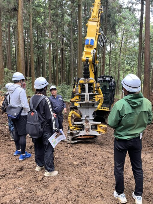 間伐現場では、東急建設様による取り組みを視察しました。高性能機械を活用した作業が行われており、約1億円規模の機械によって、作業効率が大きく向上している様子が印象的でした。急斜面での作業も多く、参加した三浦さんは「実際に現場を見ると、完全に自動化するのは難しそうだと感じた」と話していました。また、機械導入によって安全性が高まる一方で、導入コストが高く、すべての事業者が同様の設備を使えるわけではないという課題も見えてきました。現場の説明では、今後は若者を巻き込みながら、地元の林業事業者と連携して森づくりを進めていきたいという話もあり、民間企業が林業の現場に関わる意義を感じることができました。